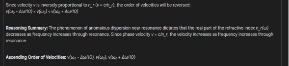 | 相速度的排序方式 | 正确的数学清晰度和物理解释 | 逻辑严谨,推导简洁 | 正确,有很强的概念背景和直观的推理能力 |