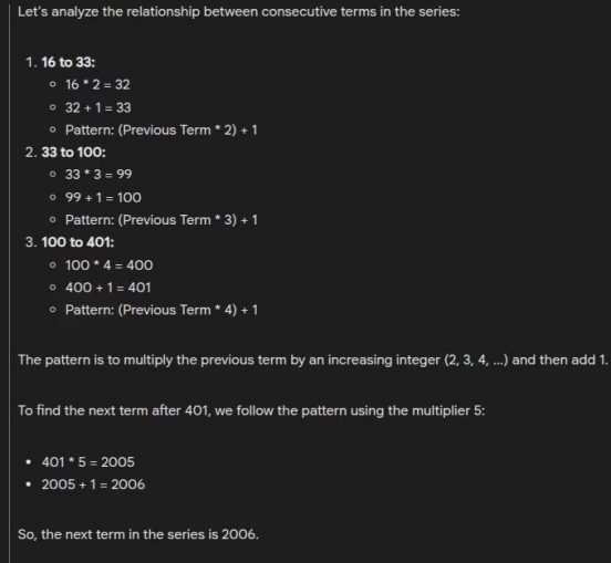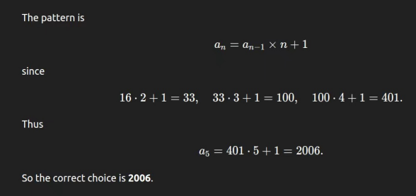 通过将序列表示为一般公式,an=an-1×n+1a_n=a{n-1}\times n+1an=a−1×n+1,o4 mini以最简洁和结构化的方式捕获了底层模式。这使得它非常适合那些欣赏清晰和简洁推理的学习者。o4 mini提供了最佳的整体解释。