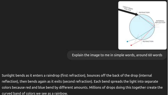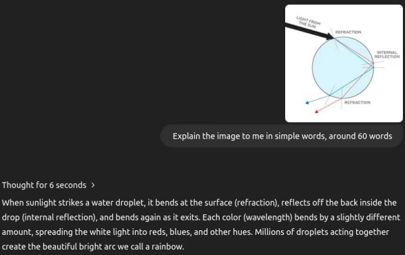 o3模型在清晰度、完整性和简洁性之间取得了最佳平衡,使其成为普通受众的理想选择。它清晰解释了彩虹的形成过程,既未让读者被过多细节淹没,又涵盖了折射、内部反射以及多个水滴如何共同作用形成彩虹等关键内容。其简洁的风格易于理解和吸收,是解释彩虹现象的最有效选择。