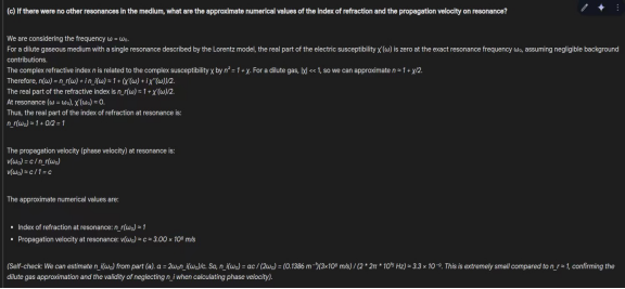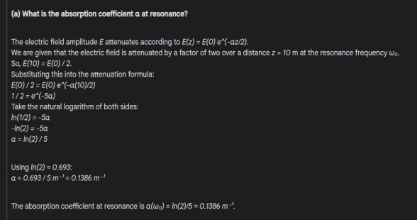 输入提示:色散气体介质。研究发现,稀薄气体介质在频率上表现出单一的光学谐振 \\(\omega _0 = 2 \pi\cdot 10^{15} \\赫兹。频率上平面波的电场 \\(\omega _0) \\)在这种介质中传播,在10米的距离上衰减了2倍。吸收共振的频率宽度为 \\( \Delta \omega \\). (a)吸收系数是多少 \\( \alpha \\)共振?(b)按升序排列各频率的传播速度是多少 \\(\omega _0, \omega _0 + \Delta\omega / 10 \\),和 \\(\omega _0 – \Delta\omega / 10 \\)?并展示推理。(c)如果介质中不存在其他谐振,谐振时折射率和传播速度的近似数值是多少?