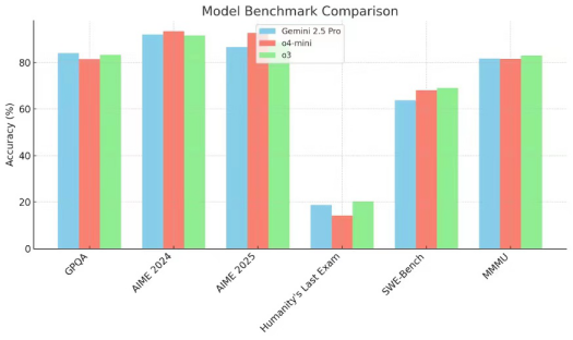 为了更好地了解尖端人工智能模型的性能,可以在一系列标准化基准测试中比较Gemini 2.5 Pro、o4 mini和o3。这些基准测试评估了各种能力的模型,其范围从高等数学和物理到软件工程和复杂推理。