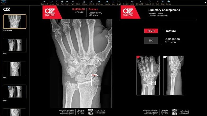 产品示例(医疗保健):想象一下放射学软件平台中的一项功能:当放射科医生检查 X 光片或 MRI 时,AI 算法会并行运行,突出显示看起来可疑的区域(可能是肿瘤的阴影或细微的骨折线)。医生会查看这些突出显示的内容,然后确认或排除它们。AI 必须高度准确地标记出它们——太多的误报会浪费医生的时间或削弱医生的信任;而漏报(遗漏的问题)则更糟糕。因此,系统会进行调整以优化灵敏度和特异性。这种增强的工作流程并不能取代医生(事实上,医生不会接受仅由 AI 进行的自动诊断),但它可以优化结果:患者受益于医生 + AI 的综合智能。AI 有效地扩展了医生的能力——它可能可以从数百万张图像中检测出模式(这是人类终其一生都无法做到的)——而医生则提供情境判断和问责。