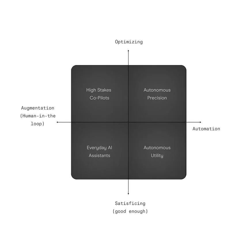 总结一下这条轴线:优化功能力求达到一流的输出,可能在高风险或竞争激烈的质量用例中需要用到;而令人满意的功能则满足于“足够好”,这通常能够实现速度、规模和用户便利性。这两种方法都能创造价值——关键在于将方法与用户的实际需求相匹配。定义了这两个轴线后,我们现在可以将它们组合成一个矩阵,并检查由此产生的四个象限。