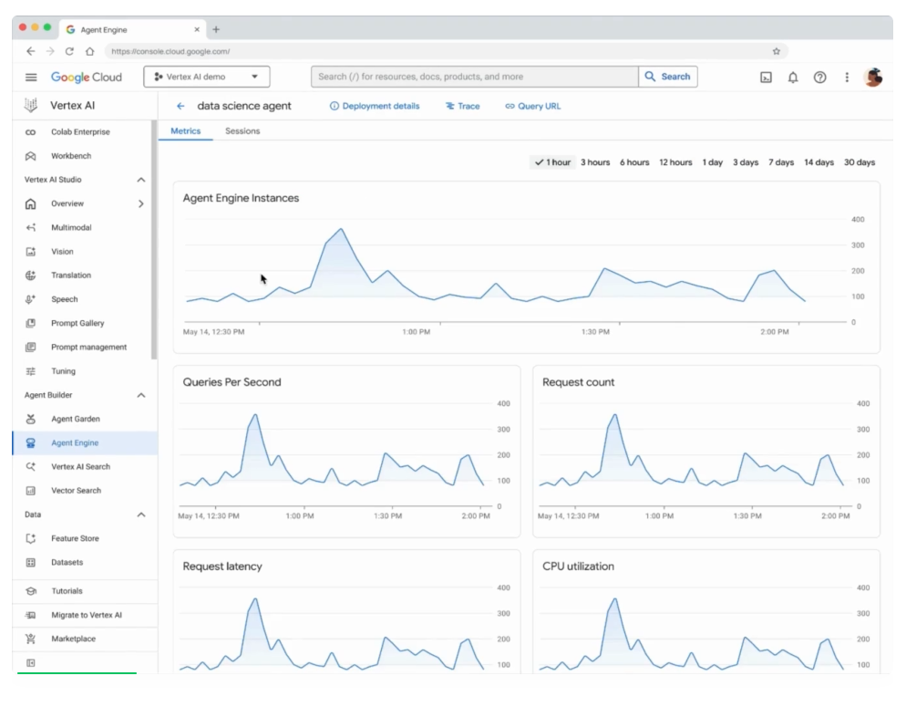 UI引擎可在谷歌云控制台中访问,提供了一个全面的仪表板,用于查看和管理已部署的智能体、列出会话、跟踪和调试操作以及监控智能体。