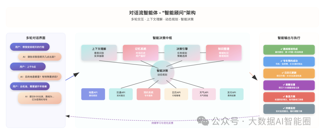苹果的Siri、谷歌助手,本质上都属于这种类型。当你说”帮我安排明天的行程”时,它会问你:”几点出发?去哪里?有什么特殊要求?”基于你的回答,制定个性化的方案。