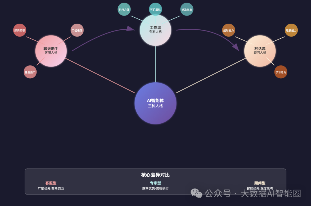 智能体本质上有三种”人格”:客服型、专家型、顾问型。每一种都有自己的优势领域和适用场景。 理解这个差异,是用好AI智能体的第一步。