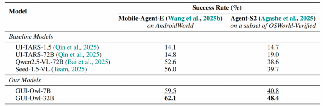 同时,结合离线提示式拒绝采样和迭代式的在线训练,模型的推理能力在真实任务中被反复打磨和验证。这种全面的训练方式,使得 GUI-Owl 不再是为某个特定框架「定制」的,而是天然具备了跨环境、跨角色的泛化能力。