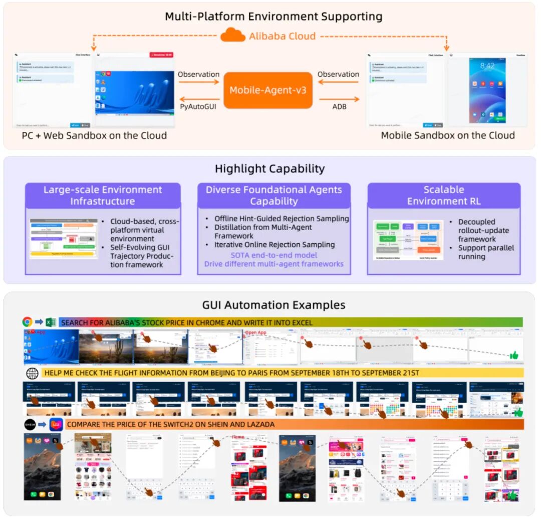 这是一个基于云环境的全链路开源解决方案 —— 它既是当前最强的开源单体 GUI Agent 模型,也包含为其深度优化的多智能体框架。我们通过搭建覆盖 Android、Ubuntu、macOS、Windows 的多操作系统云环境基础设施,并结合阿里云的云手机与云电脑,实现了直接在云端沙箱中运行、调试、采集数据的全新范式。