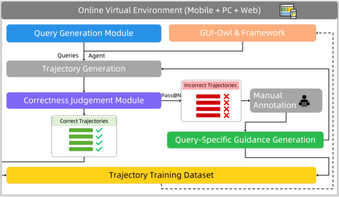 在大多数 GUI Agent 方案中,采集高质量训练数据是最大的瓶颈,不仅慢,而且贵。为此,我们没有走传统的人工标注老路,而是直接打造了一整套跨平台的云环境基础设施与一套名为「自我进化 GUI 轨迹生产链路」的数据闭环系统。这套系统让 GUI-Owl 和 Mobile-Agent-v3 自己生成任务轨迹、筛选出正确轨迹,再反过来对自身进行迭代优化,将人类的参与降到最低,形成一个跨平台、自动化、可持续的数据生产与模型优化循环。