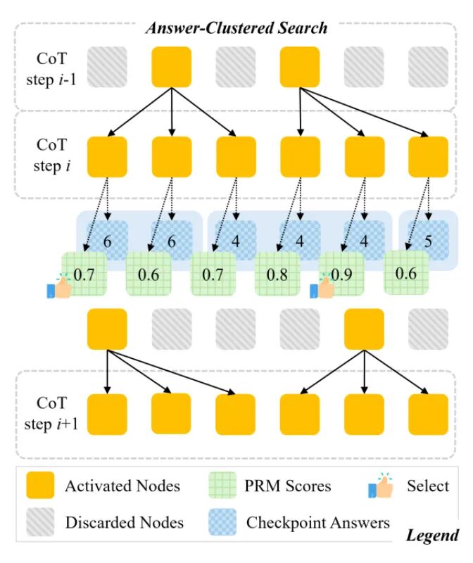 - 答案聚类搜索:把检查点答案一样的推理路径归为一组,并从每组内选择路径继续推理。