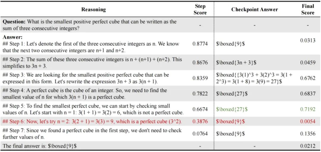 如图所示,模型推理完成得到的答案是 9,而正确答案是 27。但回顾推理过程中的检查点答案可以发现,模型在第 4 和第 5 步已经得出了 27 这个答案,而错误出在第 6 步 ——9 是一个完全平方数而不是平方立方数。而 CCA 记录收集了所有检查点答案,并综合考虑所有候选答案选出最终结果。可以看到第 5 步的检查点答案得到了最高分 0.7192,该答案被 CCA 恢复并修正了错误答案。