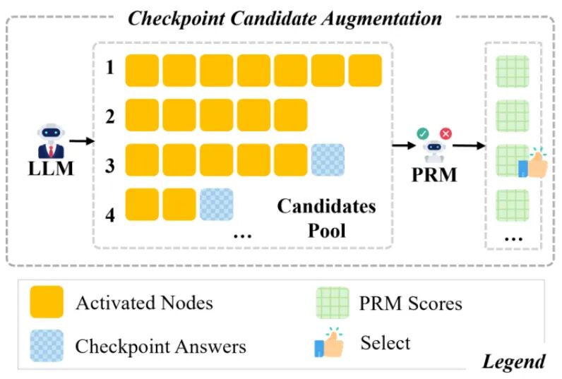 为解决这些问题,华为诺亚方舟实验室联合香港中文大学等机构的研究人员提出逐步推理检查点分析(SRCA)框架 —— 在推理步骤间引入 “检查点”,并集成两大核心策略:(1)答案聚类搜索(Answer-Clustered Search):根据中间检查点答案对推理路径进行分组,在保证质量的同时维持路径多样性;(2)检查点候选增强(Checkpoint Candidate Augmentation):利用所有中间答案辅助最终决策。