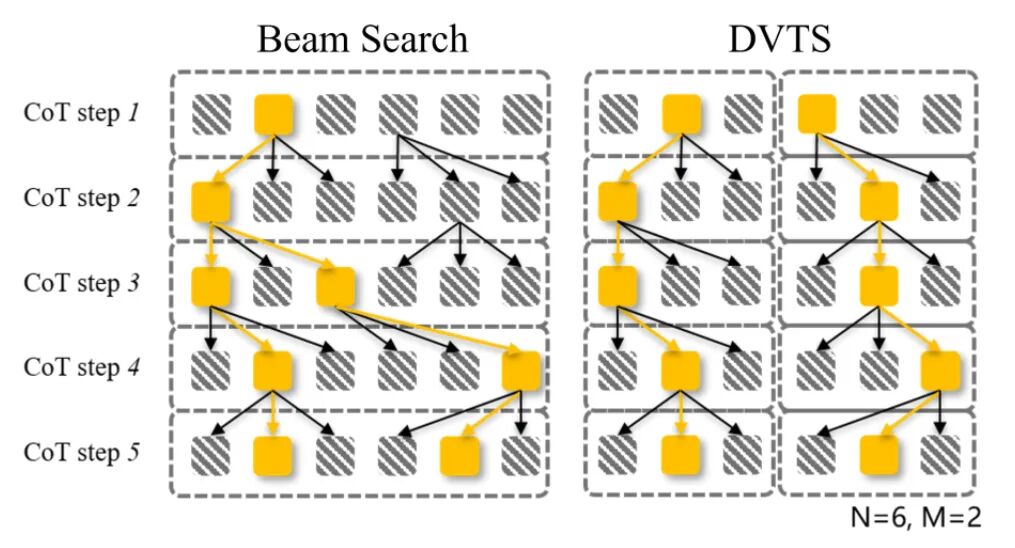 - DVTS(Diverse Verifier Tree Search):(右图)同时维护多个独立的推理树,每棵树向下探索 PRM 打分最高的路径。强迫模型探索不同解题思路,减少 “一条道走到黑” 的风险。