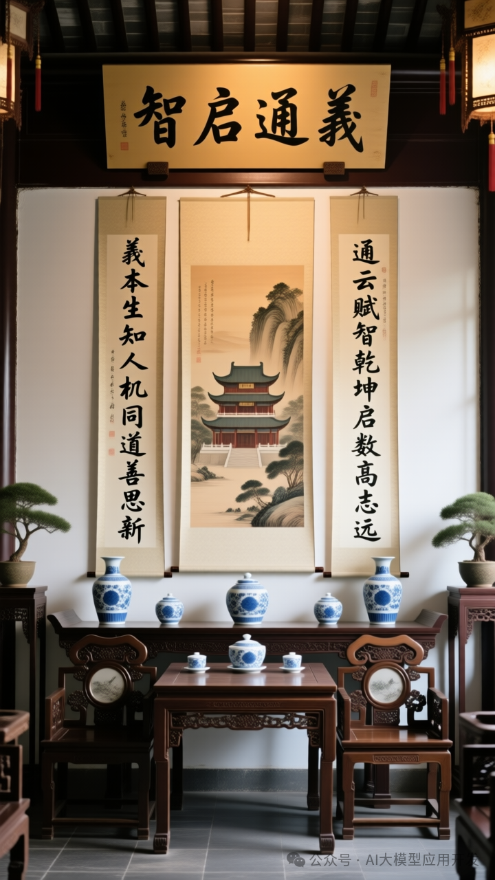 提示词: 一副典雅庄重的对联悬挂于厅堂之中,房间是个安静古典的中式布置,桌子上放着一些青花瓷,对联上左书“义本生知人机同道善思新”,右书“通云赋智乾坤启数高志远”, 横批“智启通义”,字体飘逸,中间挂在一着一副中国风的画作,内容是岳阳楼。