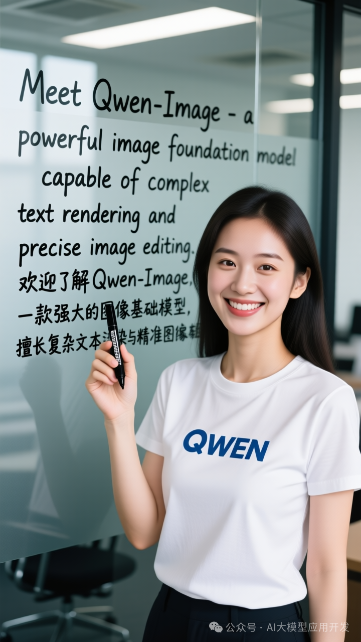 提示词: 一个穿着”QWEN”标志的T恤的中国美女正拿着黑色的马克笔面向镜头微笑。她身后的玻璃板上手写体写着 “Meet Qwen-Image – a powerful image foundation model capable of complex text rendering and precise image editing. 欢迎了解Qwen-Image, 一款强大的图像基础模型,擅长复杂文本渲染与精准图像编辑”