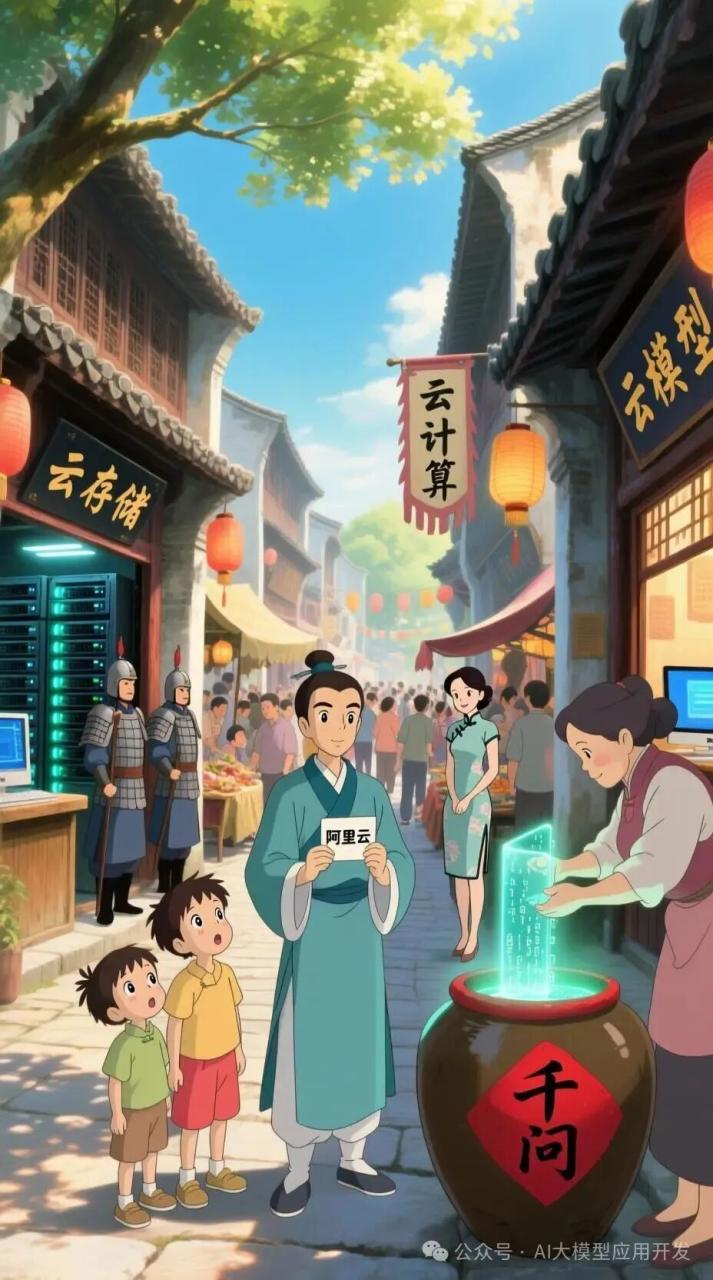 提示词:宫崎骏的动漫风格。平视角拍摄,阳光下的古街热闹非凡。一个穿着青衫、手里拿着写着“阿里云”卡片的逍遥派弟子站在中间。旁边两个小孩惊讶的看着他。左边有一家店铺挂着“云存储”的牌子,里面摆放着发光的服务器机箱,门口两个侍卫守护者。右边有两家店铺,其中一家挂着“云计算”的牌子,一个穿着旗袍的美丽女子正看着里面闪闪发光的电脑屏幕;另一家店铺挂着“云模型”的牌子,门口放着一个大酒缸,上面写着“千问”,一位老板娘正在往里面倒发光的代码溶液。