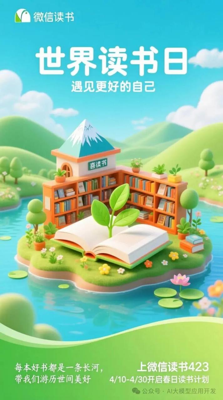提示词:清新春日为主题,采用 3D卡通渲染风格。画面中心是一本打开的书,书页上长出媺绿的叶子,书放置在一个类似小岛的平台上。小岛上有书店元素(如书架、书本陈列)、绿植(小树、花、小建筑(带有喜马拉雅标识)朵),周围环绕着湖水和荷叶,背景是蓝天白云和起伏的绿色山丘。文字内容:海报顶部有“微信读书”小标识 ;主标题为“世界读书曰”,副标题为“遇见更好的自己”,底部左侧有手写体“每本好书都是一条长河,带我们游历世间美好”文案,右侧“上微信读书423,4/10-4/30开启春日读书计划”信息。底部信息呈现在一个有曲线的绿色渐变色块上面:整体色彩以清新的蓝绿色系为主色调,搭配明亮的橙色、黄色等,营造出活泼、充满生机的春日氛围