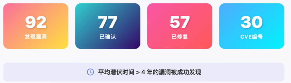 研究团队在 Linux 内核上验证了 KNighter 的效果。将历史补丁作为训练源,模型合成的检查器成功挖掘出 92 个长期潜伏的漏洞,其中 77 个已被维护者确认,57 个已修复,30 个获得了 CVE 编号。这些漏洞平均潜伏时间超过 4 年,可见其难以通过现有工具发现。