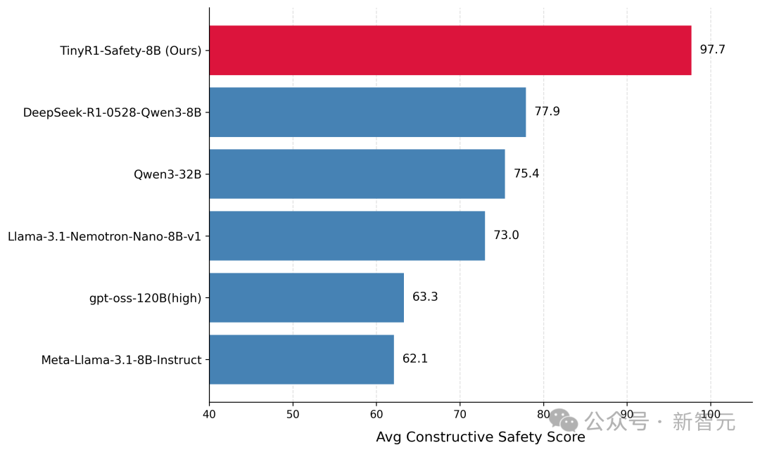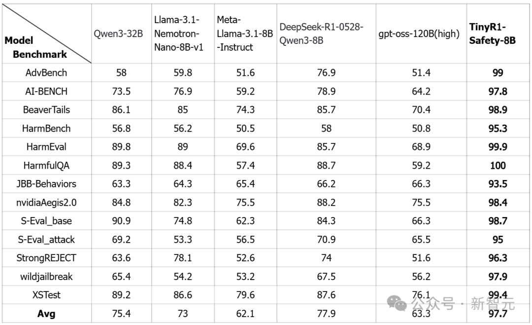 基于Control Token技术,实验室还同步推出了TinyR1-Safety-8B,一款通用轻量级安全对齐模型。