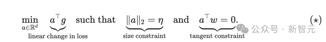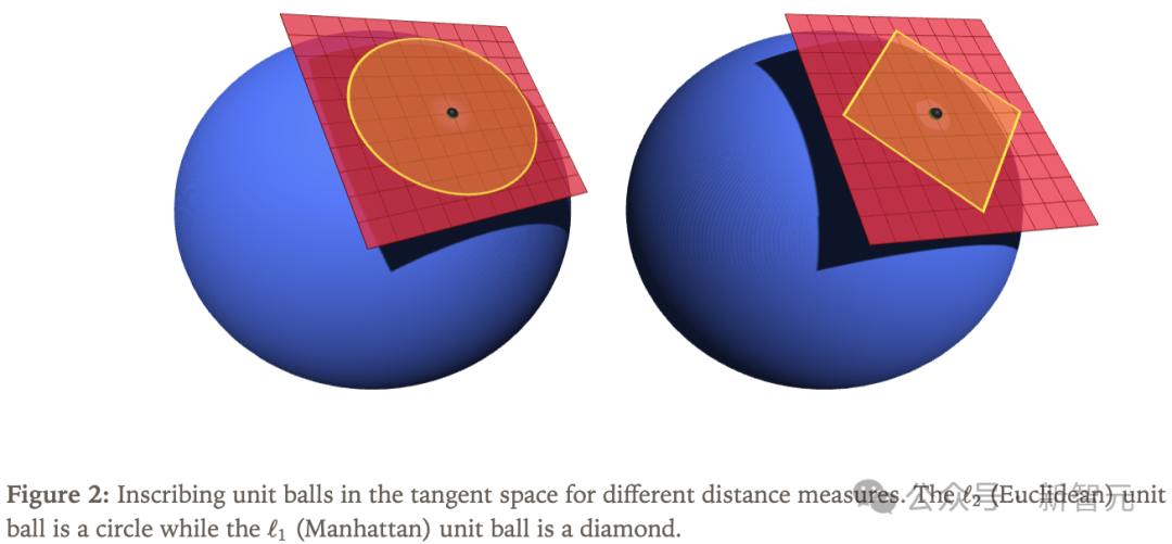 为了用数学表达这个过程,我们可以把「在流形约束和特定距离度量下的最优更新方向」看作一个带约束的优化问题,可以用一个搭配欧几里得范数的超球面来举例。