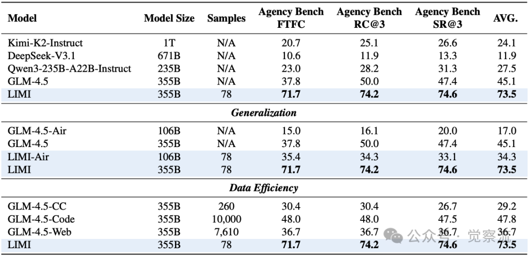 价值:对AI研究员而言,LIMI意味着可以将资源从大规模数据收集转向更精细的数据工程,大幅降低研究成本。上表中的数据表明,即使是106B参数的模型,通过LIMI方法也能达到接近355B模型的性能,这为资源受限的研究团队提供了新的可能性。