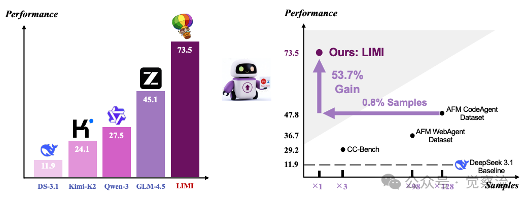 上图揭示了一个当下反常识的事实:在智能体能力培养上,”少”真的能带来”多”。左边图表清晰显示,LIMI仅用78个样本就达到了73.5%的性能,大幅超越所有使用大规模数据训练的模型。但真正震撼的是右边图表——LIMI用128倍更少的样本(78 vs. 10,000),实现了53.7个百分点的性能提升!