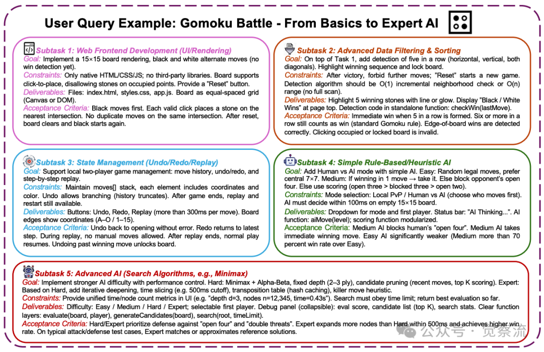 长时程任务特性:如上图所示,Gomoku游戏开发任务的五个子任务形成了清晰的层次结构:技术实现能力(子任务1-2)、状态管理能力(子任务3)和AI策略能力(子任务4-5)。这种多层次任务结构要求智能体能够维持连贯的思维链条,将复杂目标分解为可管理的子目标,并在各阶段保持状态一致性。