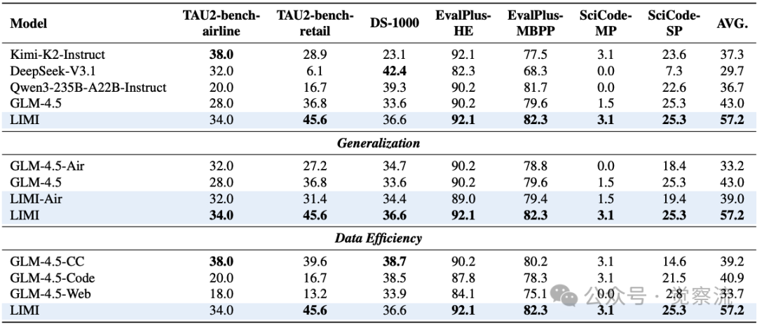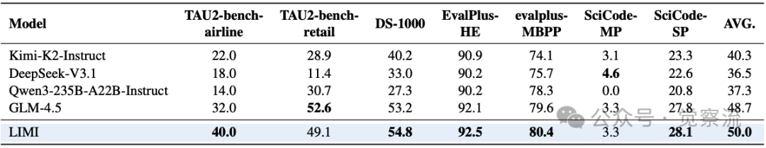 LIMI不仅在AgencyBench上表现出色,在多样化基准上也保持优势。下表显示,LIMI在TAU2-bench、EvalPlus、DS-1000和SciCode等基准上平均性能达57.2%,比GLM-4.5-Code(40.9%)高出39.9%的相对提升。