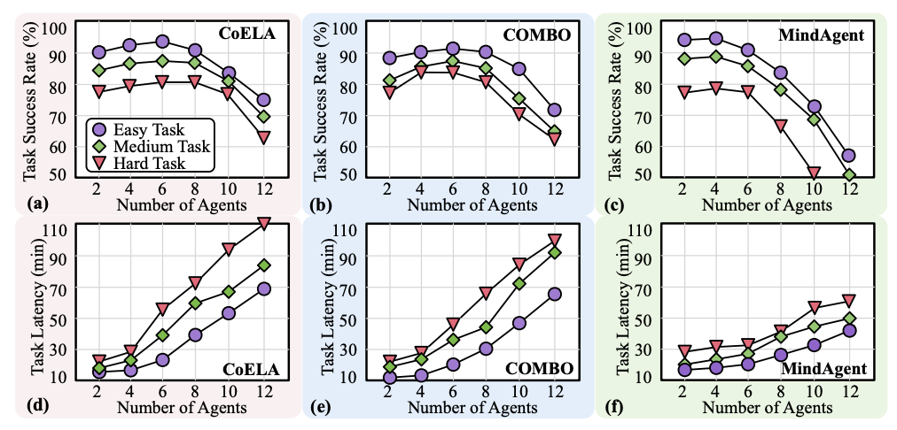 有限的可扩展性: 随着智能体数量的增加,去中心化系统会面临通信轮次爆炸性增长和效率下降的问题;而中心化系统则由于单一规划者难以处理复杂的多智能体协同,导致任务成功率急剧下滑。