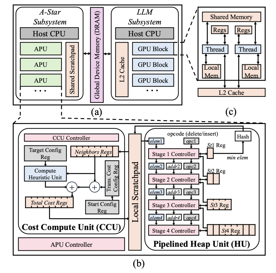 - 异构硬件系统: ReCA 为高阶和低阶规划匹配了最合适的计算单元。它采用 GPU 子系统处理 LLM 的高阶规划,同时为精准路径规划等低阶任务设计了专门的硬件加速器。
