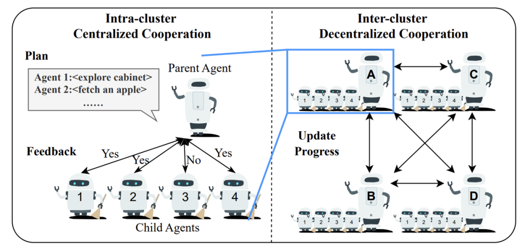 - 分层协作规划: 为了解决扩展性难题,ReCA 引入了一种新颖的分层协作模式。在小范围的「簇」内,采用「父-子」智能体的中心化模式高效规划;在「簇」之间,则采用去中心化模式进行通信,更新彼此进度。这种混合模式兼顾了规划效率和系统规模。