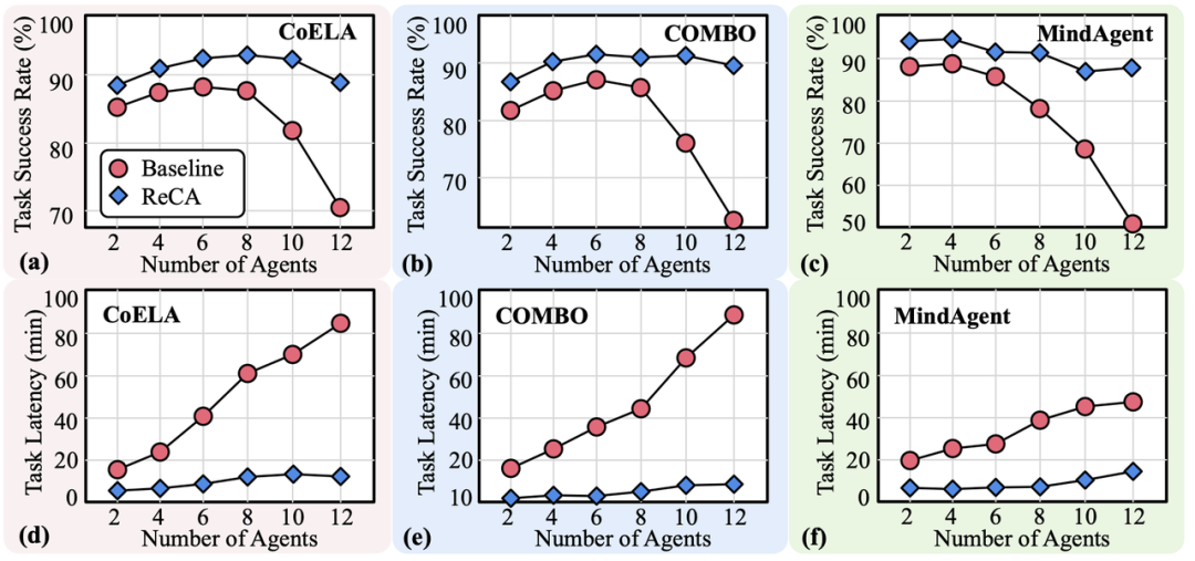 - 可扩展性: 即使在 12 个智能体的大规模协作场景下,ReCA 依然能保持 80-90% 的高成功率,而基线系统的成功率已跌至 70% 以下。