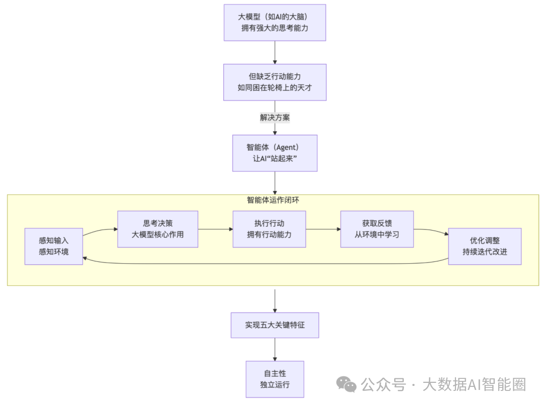 智能体的出现,正是为了让AI”站起来“,拥有感知环境、自主决策、执行任务的完整能力。