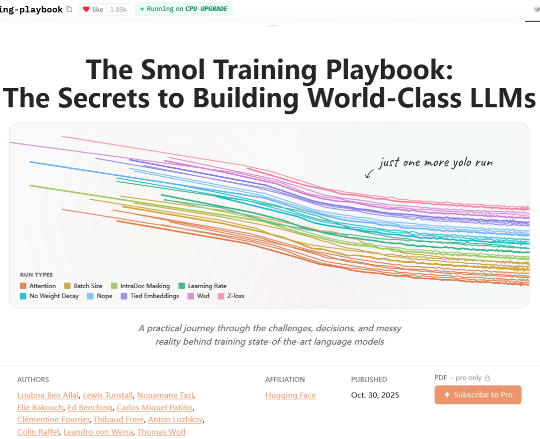 Hugging Face发布了《The Smol Training Playbook:The Secrets to Building World-Class LLMs》模型训练秘诀。