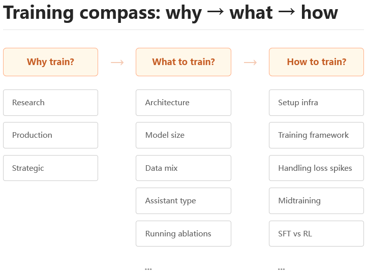 这部分构成了手册的主体,但在决策阶段就需要确立核心哲学:先用极小的成本进行消融实验,再进行中等规模的验证,最后才投入全规模训练。每个阶段都必须有可靠、可量化的评估指标作为导航,同时对存储、网络、节点故障率等基础设施成本有清醒的认识。