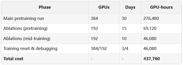 在GPU选型上,Hugging Face的经验是,对于小规模的消融实验(小于1000亿token),使用4090消费级显卡集群的性价比远超昂贵的H100。他们用这种方式完成了绝大多数的早期实验,节省了约80%的成本。