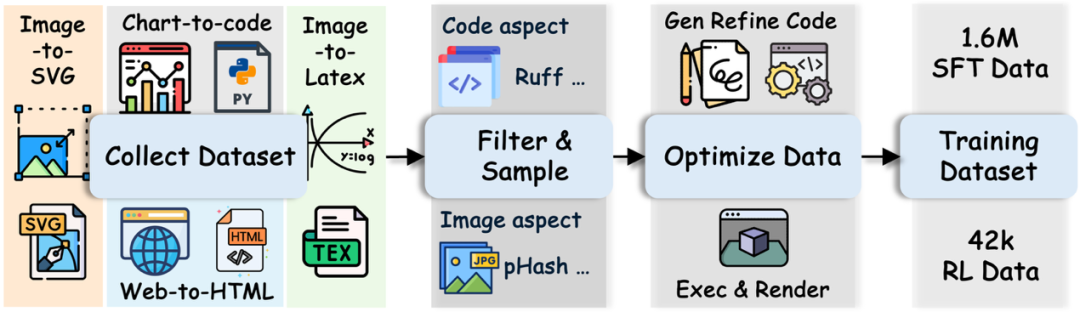 研究团队首先构建了一个包含 1.6M 图像 – 代码对的大规模监督微调(SFT)语料库 。该语料库不仅覆盖了直接代码生成任务,还引入 “视觉代码优化” 的新任务 。在这项任务中,模型会接收到一个目标图像和一个 “有缺陷” 的代码片段(包含逻辑错误或只能部分渲染)。模型的目标是修正这段代码,使其视觉输出与目标图像精确对齐 。这一设计极大地提升了模型在代码层面的纠错和优化能力,为后续的强化学习阶段奠定了坚实基础 。