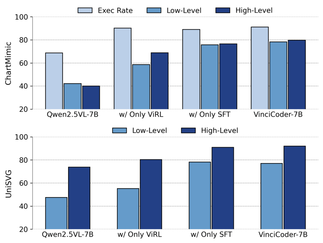 - 策略有效性:消融实验证明,仅 SFT 阶段的 VinciCoder-SFT 就已建立起强大的基线 ;而 ViRL 阶段的引入,则成功将模型性能提升至 SOTA 水平 ,充分验证了 SFT-ViRL 两阶段策略的压倒性优势。