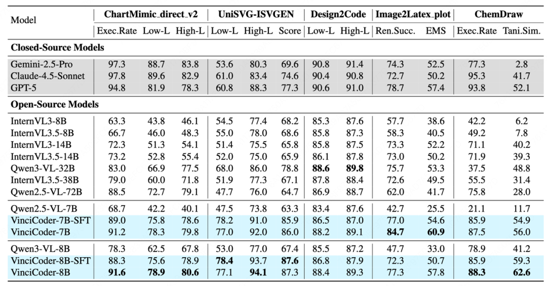 论文在五大多模态代码生成基准上进行了全面实验,对比了包括 Qwen、InternVL 等开源模型以及 Gemini-2.5-Pro、Claude-4.5、GPT-5 等闭源模型 ,核心结果如下: