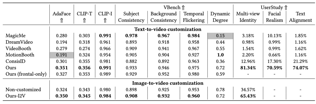 系统性实验表明,使用 multi-view 数据训练的模型,在 AdaFace 等身份指标上显著优于仅使用 frontal-view 数据的模型以及其他 video customization 的方法。缺失 multi-view 或 relighting 数据,都会导致身份一致性与真实感明显下降。用户研究结果同样明确偏好具备 multi-view 身份稳定性的生成结果。