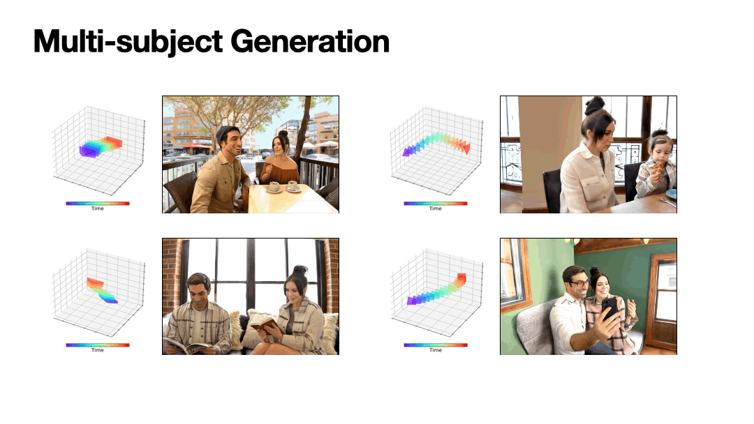 在预训练模型基础上进行微调,使用 4DGS 渲染的多视角视频作为定制数据,为每个身份引入专属 token,将身份与多视角外观显式绑定,最终模型在推理时能够精确遵循输入的 3D 相机轨迹,在未见过的视角下仍然稳定呈现同一个人。