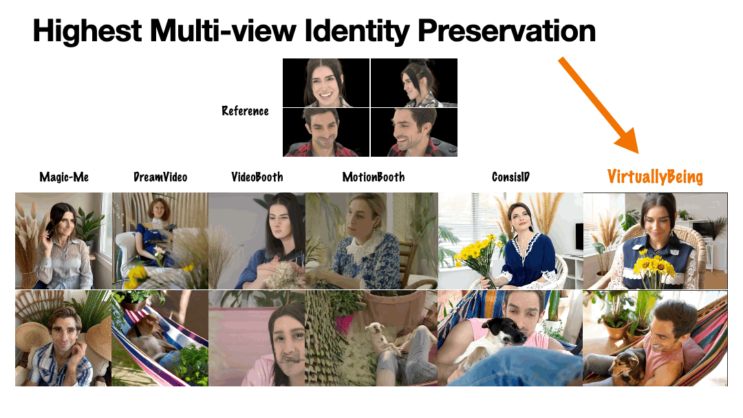 换句话说,看清一个人,不是看清一张脸,而是理解这个人在空间中如何被观察,在光线变化下如何呈现。身份不是一个静态的 2D 属性,而是一个 4D(空间 + 时间)一致的概念,这正是 Virtually Being 所要系统性解决的问题。