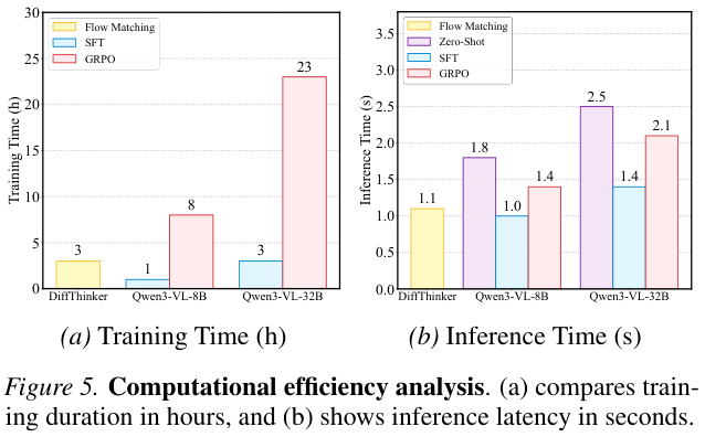 上图左侧展示了训练时间的对比,DiffThinker的训练开销远低于基于强化学习(GRPO)的大模型训练方法。右侧的推理时间对比则进一步印证了其在实际应用中的高效性。