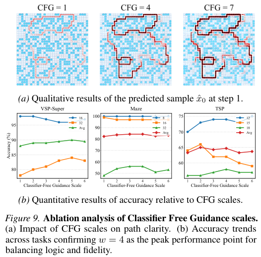 在DiffThinker中,CFG扮演了逻辑放大器的角色。当CFG比例为1时,模型生成的路径微弱且犹豫不决;当比例过高(如7)时,图像会出现过度饱和与伪影。