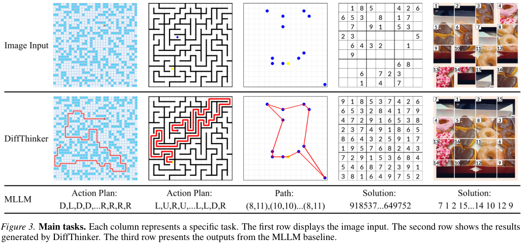 第一行是输入,第二行是DiffThinker的输出,第三行是传统大模型的输出。