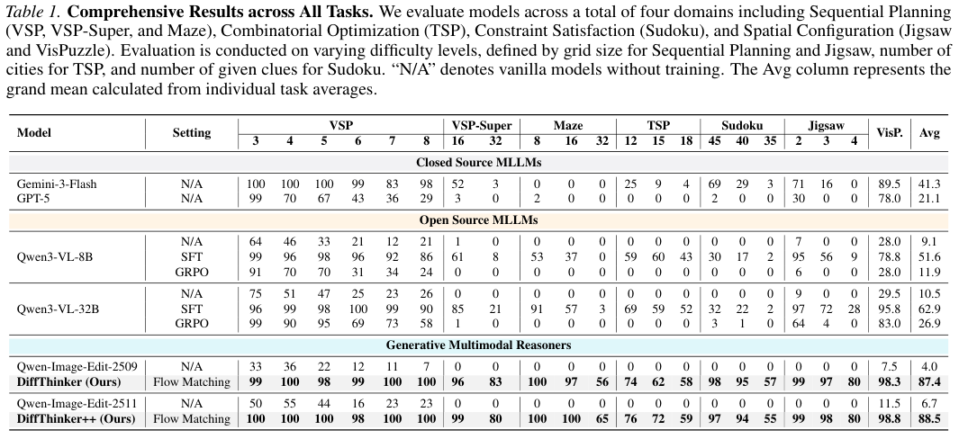 在涉及顺序规划、组合优化、数学约束满足和空间配置的七大类复杂任务中,DiffThinker展现出了对现有顶级闭源模型的碾压态势。