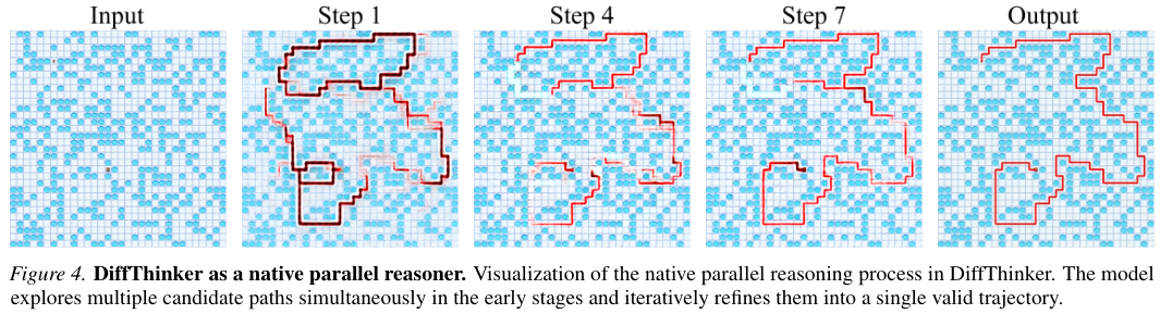 DiffThinker则不同,它在生成的初期,实际上是在同时探索多条可能的路径。