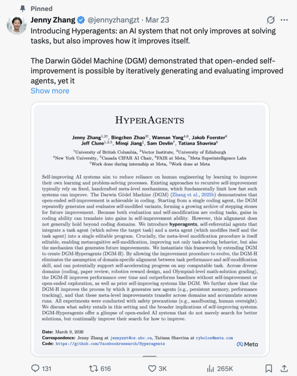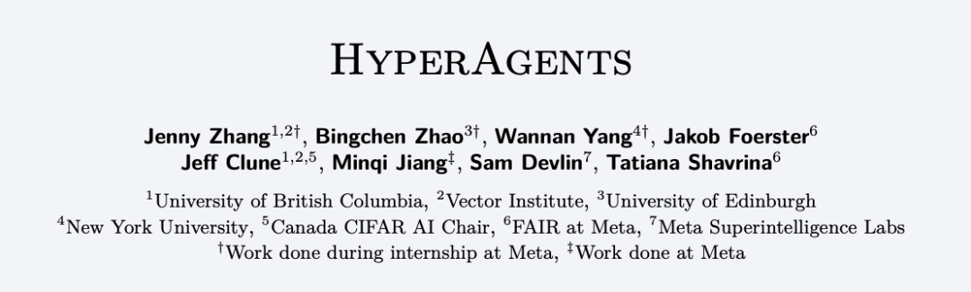 最近,Meta研究团队的一篇题为HYPERAGENTS(超级智能体)的论文迅速刷屏。