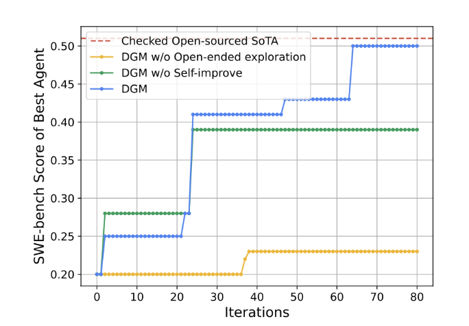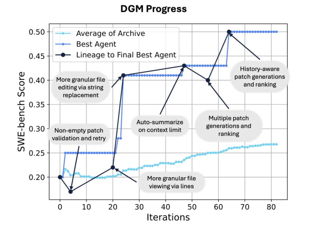 在SWE-bench上,DGM自动将其性能从20.0%提升至50.0%。
