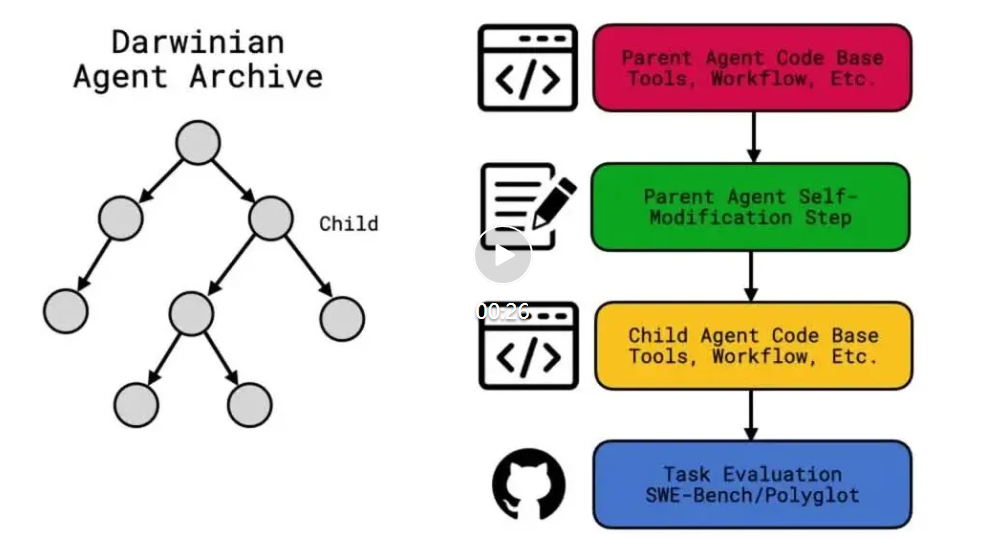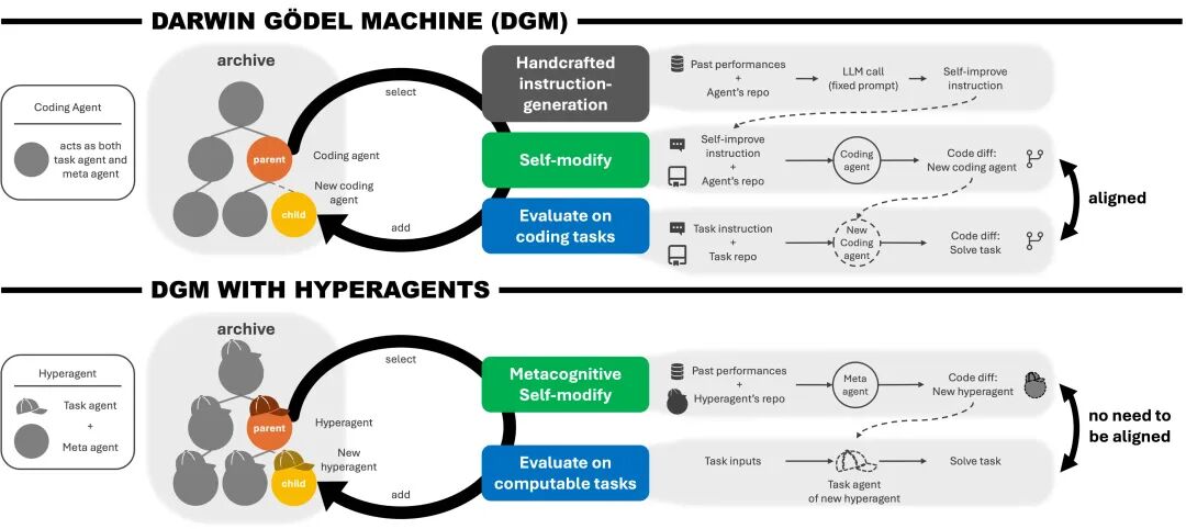 - 元级进化:在Hyperagents中,“改进的方法”本身也是可以被改进的。这使得系统不再要求任务与修改必须对齐,从而实现了跨领域的“元认知自我修改”。
